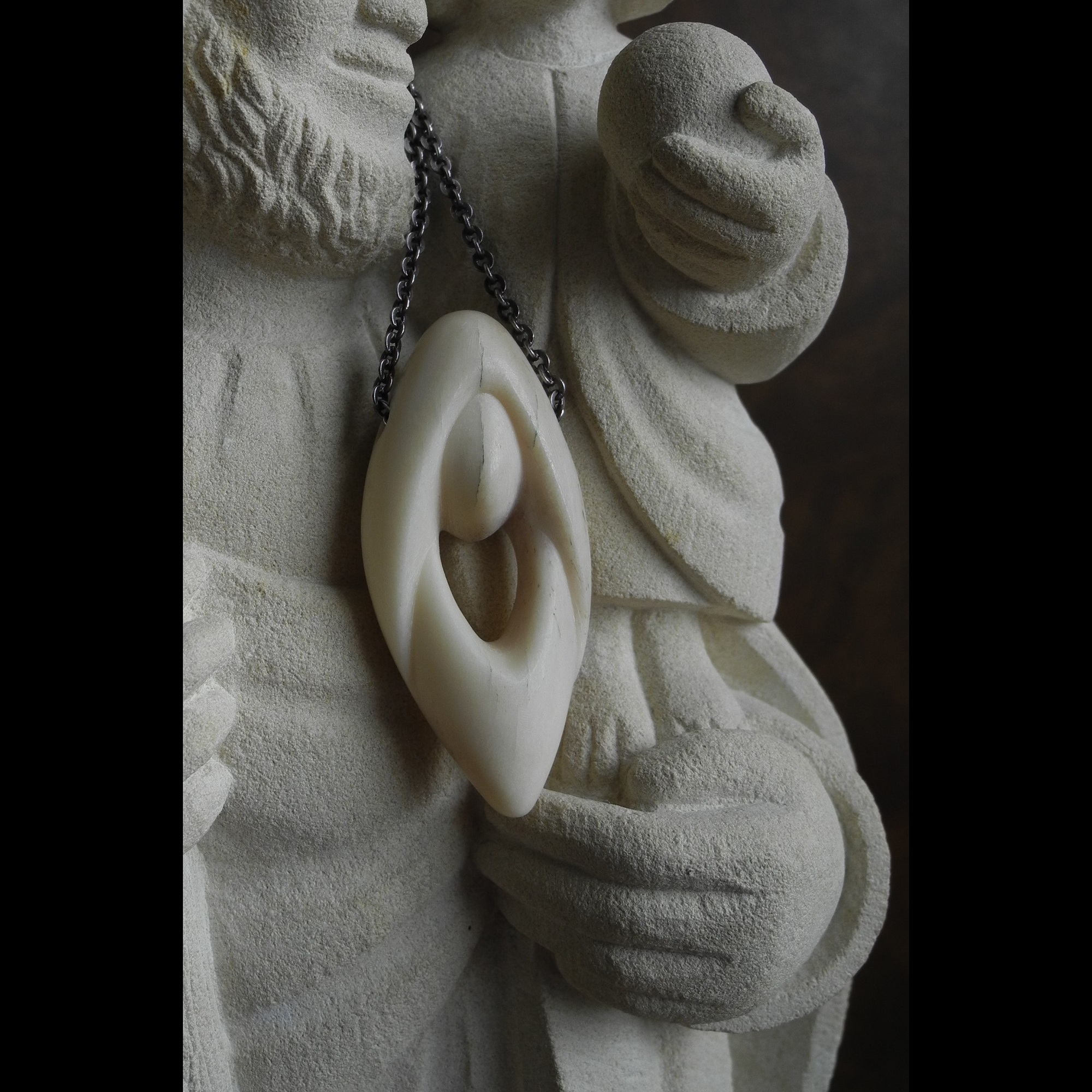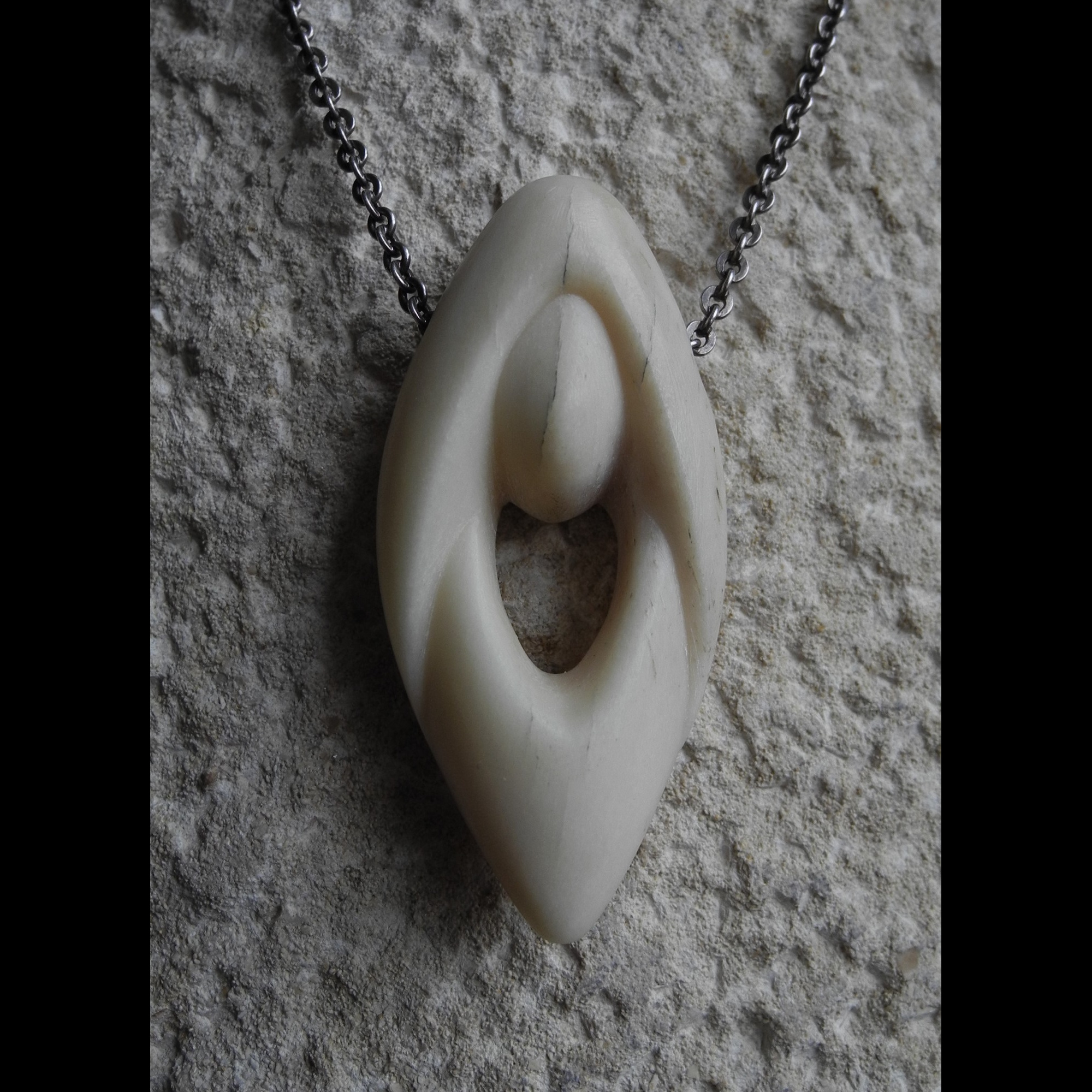 My ethos as a carver of bone: I often retain raw elements of the natural bone, a tactile secret on the reverse of the pendant – respecting the nature and history of the piece.